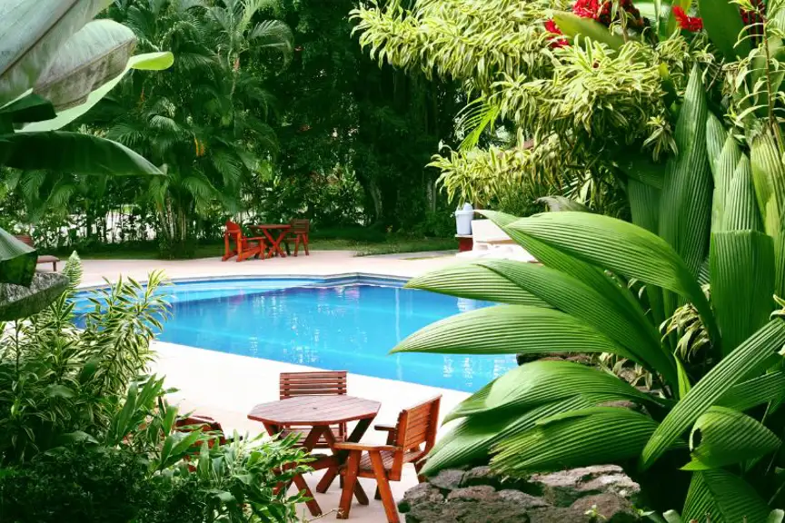 Resort style gardens are inspired by tropical garden styles characteristic of Bali and other parts of South East Asia. Resort style gardens are perfect for areas in Australia with subtropical and tropical climates; however, with proper plant selection, it is possible to also adapt this style for cooler parts of Australia. Emphasising relaxation, resort gardens often have flowing lines, lounges, bamboo, rattan or timber furniture, market umbrellas, barbecue and entertainment areas. In hot climates, shade, water features, pools and spas all cool things down. Consider using design elements such as paving, decking, boardwalks and ropes, pebbling and stone slabs. Typical plantings are close together and include foliage plants, palm trees and bromeliads.