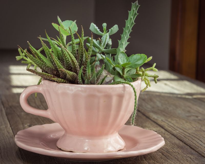 - Succulents – are very suitable are succulents. Visit your local nursery and you will be sure to find a tiny sized succulent plant. Other species mentioned are very small ivy, violets spring, the ficus or primroses. To transplant these plants within the tea cup, you can proceed with a classical transplantation, taking care to arrange then on the bottom a little earth, then move the seedling and fill with other specific soil, without going to the brim.