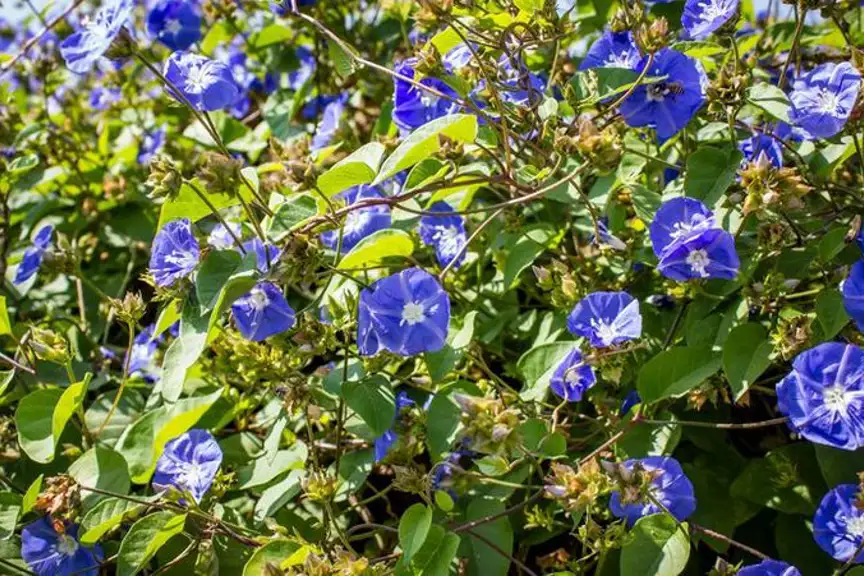 Leaves are large, light green and heart shaped, usually three lobed. Both leaves and stems are hairy. Flowers are distinct violet-blue, 5 to 8cm in diameter occurring anytime in the year, particularly in warmer months.