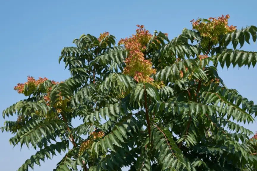 This deciduous tree grows between 10–20 m tall with large compound leaves (multiple leaflets attached to a single rachis or stem) that can grow up to 1 m long. The dark green leaflets are arranged in pairs, with up to 20 leaflet pairs on one leaf. Each leaflet has a distinctive tooth-like bump at the base of the leaf. In autumn, the leaves turn yellow and fall, but appear again in early spring; emerging as bronze-coloured leaflets before turning dark green. Clusters of small, white, or yellow-green flowers appear at the ends of branches from late spring to summer. Male and female flowers are borne on separate plants (dioecious) although some plants may have both. The male flowers release an odorous smell to attract insects to assist with pollination.