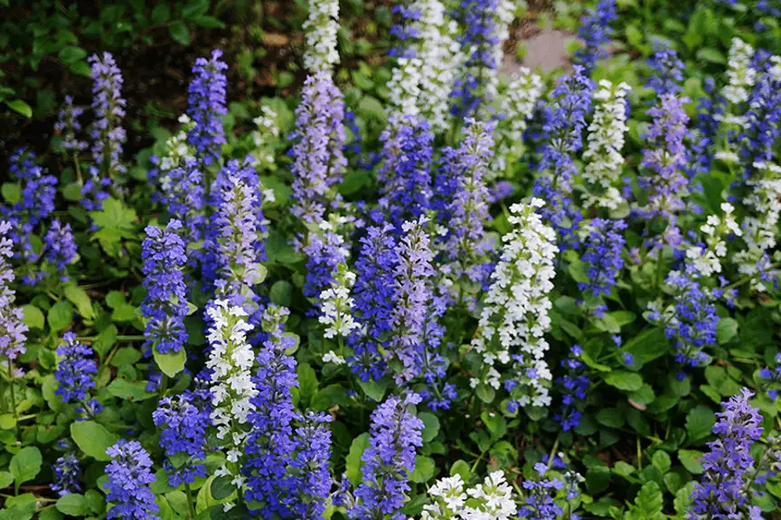 For shady spots – Native violet (Viola hederacea) spreads in damp shaded situations and produces very pretty, purple-white flowers. Ajuga, bugle flower, also sends out underground runners that help the plants to cover the soil relatively quickly. In cool climates heucheras, chameleon plant (Houttuynia) and hostas do particularly well. Hostas are almost irresistible to snails so prevent these pests from holing the foliage by judiciously sprinkling Yates Snail & Slug Bait.