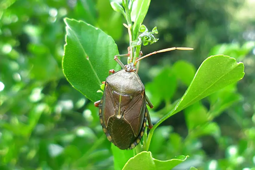 Bronze Orange Bug (Musgraveia sulciventris) is a native insect that may occur on citrus trees in home gardens. It was once limited to coastal SE Queensland and northern NSW, but has now spread to the far south coast of NSW near Bega, as well as some inland citrus growing areas of Queensland and NSW.