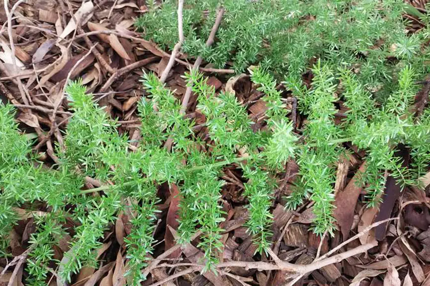 A perennial groundcover plant with sprawling wiry stems to 2 metres long arising from underground rhizomes. The small flat needle-like leaves are arranged in clusters of 2-5, 15-25mm long by 2-3mm wide. Small spines may be present in the leaf axils. Tiny (3-4mm long) white to pinkish flowers are followed by bright red berries 5-8mm across. It can cover the ground, smothering other plants and competing for soil moisture with its dense root mat.