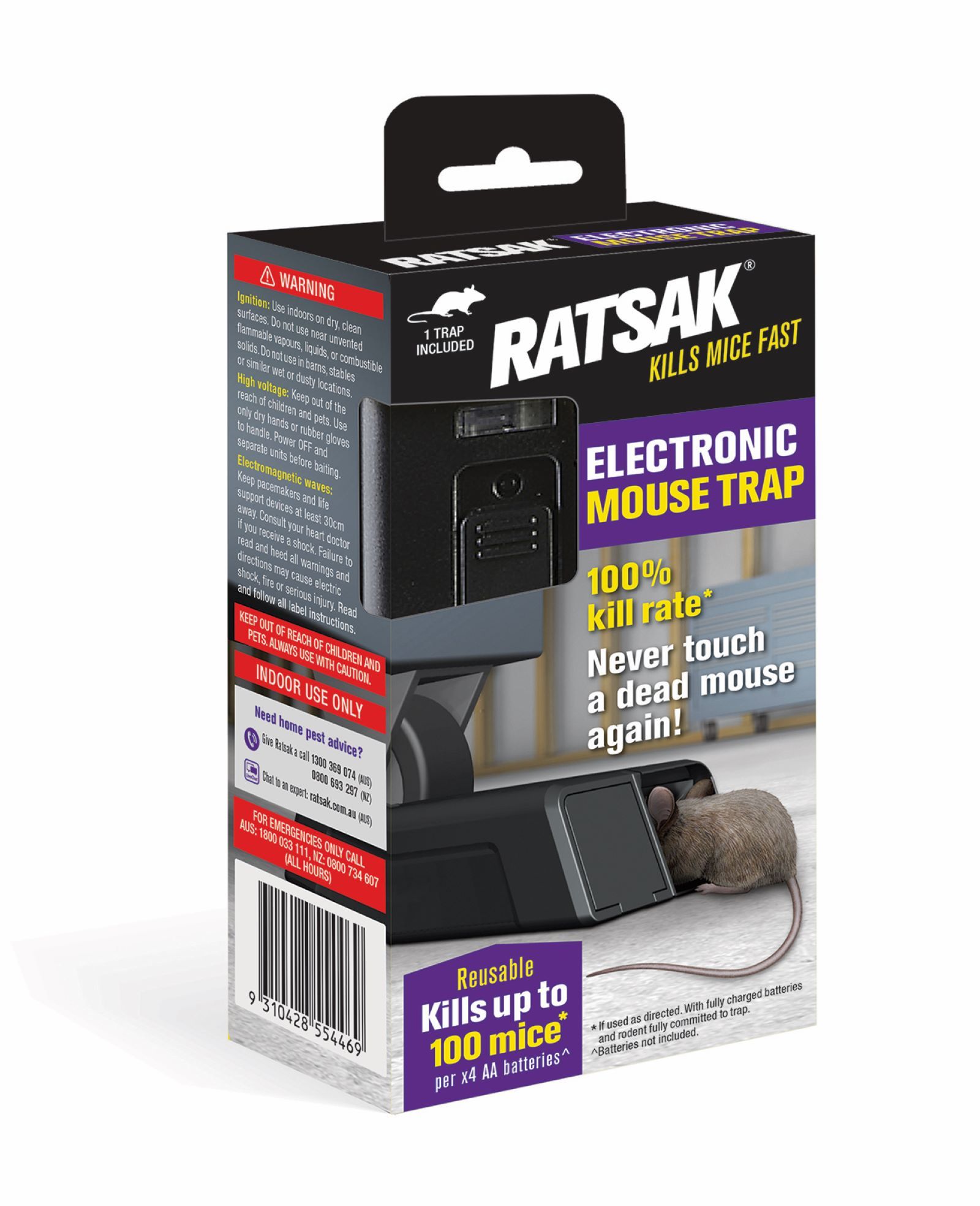 Ignition: Use indoors on dry, clean surfaces. Do not use near unvented flammable vapours, liquids, or combustible solids.Do not use in barns, stables or similar wet or dusty locations.High voltage: Keep out of the reach of children and pets. Use only dry hands or rubber gloves to handle. Power OFF and separate units before baiting.Electromagnetic waves: Keep pacemakers and life support devices at least 30cm away. Consult your heart doctor if you receive a shock. Failure to read and heed all warnings and directions may cause electric shock, fire or serious injury. Read and follow all label instructions.Batteries: 4 AA batteries are needed to operate this trap. Insert and remove batteries as indicated in the instructions. Non-rechargeable batteries are not to be recharged. Rechargeable batteries are to be removed from the applicance before being charged. Different types of batteries or new and used are not to be mixed. Batteries are to be inserted with the correct polarity as indicated in the battery compartment. Exhausted batteries are to be removed from the trap and safely disposed of. If the trap is to be stored unused for a long period, the batteries should be removed. The supply terminals are not to be short-circuited.Only clean when necessary (when debris remains on shock plates), follow instructions from manual.KEEP OUT OF REACH OF CHILDREN AND PETS. ALWAYS USE WITH CAUTION.INDOOR USE ONLYFOR EMERGENCIES ONLY, CALL 1800 220 770 (ALL HOURS)FOR GENERAL ENQUIRIES SPEAK TO US ON RATCHAT™ VIA the POP UP WINDOW AT THE BOTTOM OF YOUR SCREEN.
