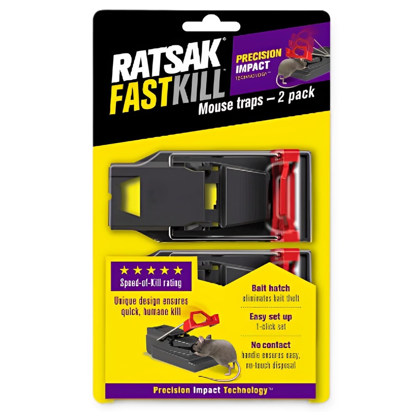 Precision Impact Technology™ - When a mouse lifts the bait cover to access the bait, the kill bar is immediately released, providing perfect placement for a quick, humane kill.