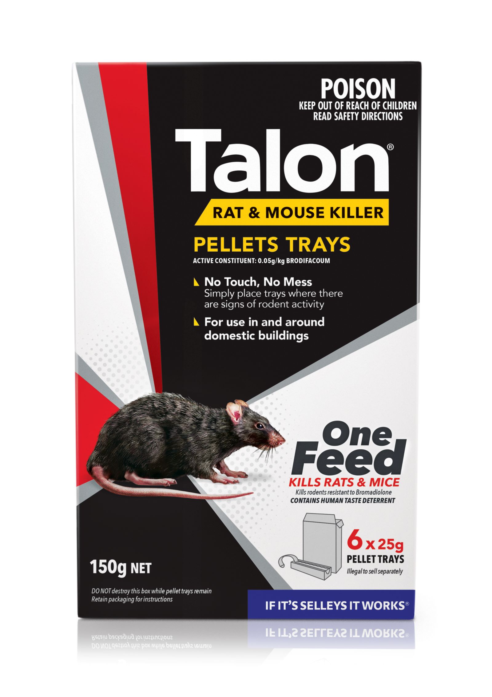 DO NOT use this product outdoors. DO NOT use unless secured in a tamper resistant bait station. Where possible, fix tamper-resistant bait stations to the ground or other structures. DO NOT use the product for longer than 35 days when treating an infestation. If rodent activity is still observed after 35 days, seek advice from the product supplier or call a pest control service. Hazardous to wildlife. Search for and dispose of dead rodents and slugs/snails in the infested area at each visit to prevent secondary poisoning. In case slugs/snails are present, move bait station to another location within the rodent infested site, away from slugs/snails. Dispose of slugs/snails, dead rodents and uneaten bait by wrapping in paper, placing in plastic bag and putting in garbage. When using the product wear disposable gloves. During cleanup and disposal operations of bait and bait stations, wear disposable gloves. Wear disposable gloves when handling rodent carcasses. Wash clothes after performing re-handling activities. CAUTION & Safety DirectionsDO NOT remove pellets from trays and DO NOT place pellet trays in the open.DO NOT place pellets in locations accessible to children, pets, domestic animals, livestock or birds. This product is hazardous and, depending on the amount eaten, may kill or injure.DO NOT let pets eat poisoned mice and rats.DO NOT exceed 3m between bait stations for mice or 9m for rats in Clean-out treatment.DO NOT touch pellets, use a scoop or measure.DO NOT contaminate dams, waterways and drains with the pellets or the used container.