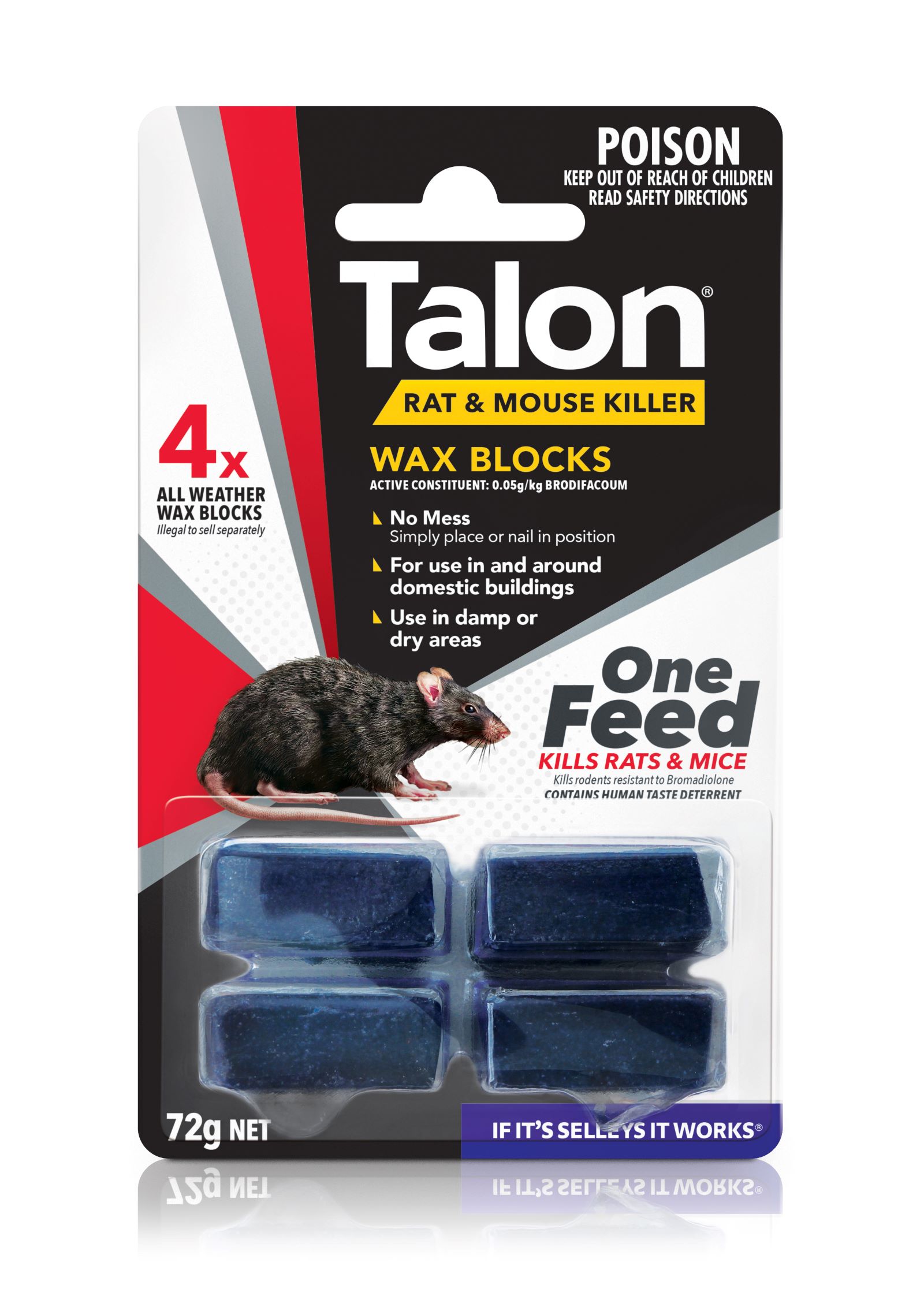 Eliminate all alternative food sources.Try NOT to touch the bait, as it deters rats and mice from consuming it.If using the option to nail in place, use gloves.Rats tend to remove Talon wax blocks, carefully pinning the blocks in place though the centre will prevent a single animal taking the block, allowing more rats to feed from the block.In general, once poisoning has commenced, rodents will be attracted to the nearest available source of water. Ensuring sources of water inside the building are covered or removed will assist in ensuring rodent leave the building before dyingUse for controlling wildlife or rodent like animals requires permission from wildlife authorities.Where it is suspected that additional rodents may be entering the building or activity has NOT stopped after approximately 2 weeks, then it is recommended to try pulse baiting. This involves baiting for 3 to 4 days then taking them away for approximately 1 week, then baiting again for 3 to 4 days and repeat the cycle until activity ceases. In more infested areas 3 to 4 cycles will usually be sufficient.Only one feed required to kill rodents within 14 days. If activity continues then additional rodents are present.Most deaths occur 4 to 7 days after consumption, but deaths may occur for up to two weeks, making baiting for at least 2 weeks is necessary.