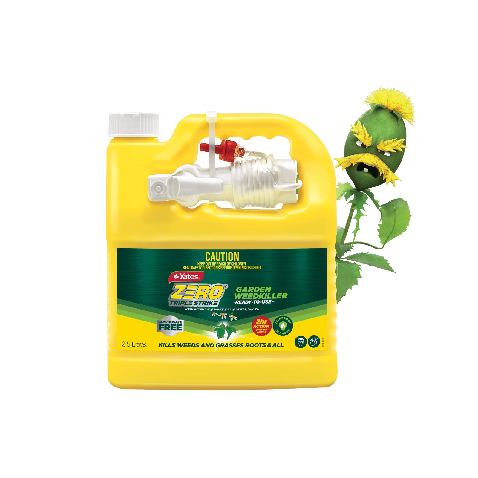 Annual and Perennial weeds and grasses including cobbler’s peg, flatweed, plantain, paspalum, billygoat weed, blue heliotrope, mallow, sida weed, feathertop rhodes grass, signal grass, giant rats tail grass, buffalo grass, green couch / bermuda grass, zoysia grass, QLD blue couch grass, kikuyu grass, cocksfoot, perennial ryegrass, silver grass, annual phalaris grass, phalaris grass, sweet vernal grass, fog grass, soft brome grass, annual ryegrass, white clover, strawberry clover, sub-clover, burr medic, lotus, sorrel, creeping cinderella, carpet grass, toad rush, pennywort, fleabane.Any visible residue remaining on surfaces should fade and biodegrade in the days following application.
