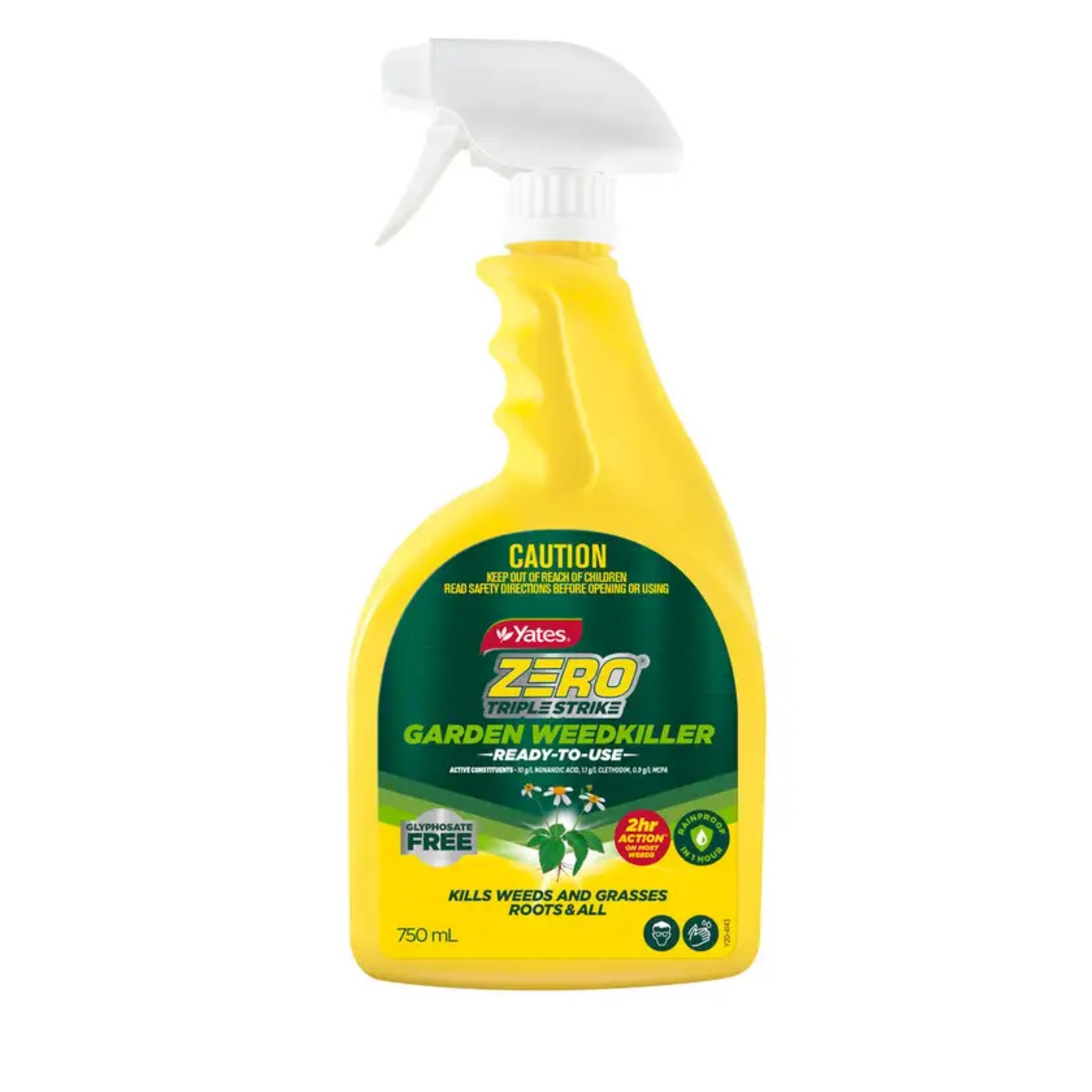 Annual and Perennial weeds and grasses including cobbler’s peg, flatweed, plantain, paspalum, billygoat weed, blue heliotrope, mallow, sida weed, feathertop rhodes grass, signal grass, giant rats tail grass, buffalo grass, green couch / bermuda grass, zoysia grass, QLD blue couch grass, kikuyu grass, cocksfoot, perennial ryegrass, silver grass, annual phalaris grass, phalaris grass, sweet vernal grass, fog grass, soft brome grass, annual ryegrass, white clover, strawberry clover, sub-clover, burr medic, lotus, sorrel, creeping cinderella, carpet grass, toad rush, pennywort, fleabane.Any visible residue remaining on surfaces should fade and biodegrade in the days following application.