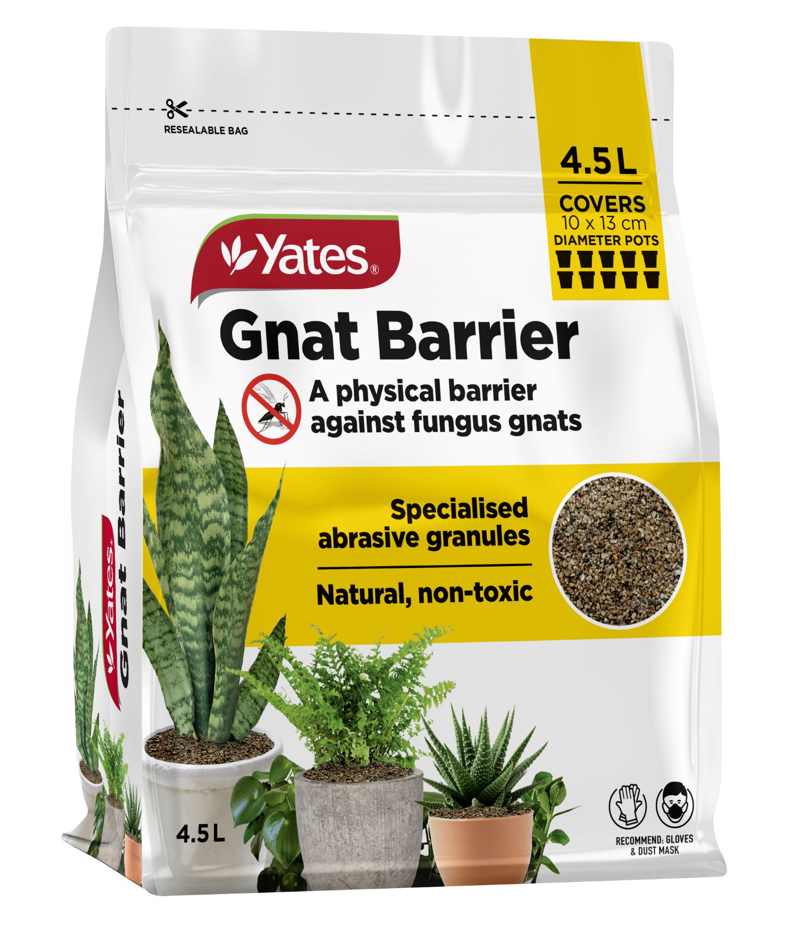 1. To open bag, tear or cut at side notches located just above the resealable strip. Seal bag tightly after use.2. Always use gloves and a dust mask when applying Yates Gnat Barrier.3. Carefully dispense the granules on top of the potting mix, making sure to cover the entire surface.4. Be sure to apply granules to a depth of at least 3cm. Product will be less effective if not applied to this depth.5. Water gently to settle the granules and to allow for even distribution.6. Top up the granule layer as needed to maintain a depth of at least 3cm.