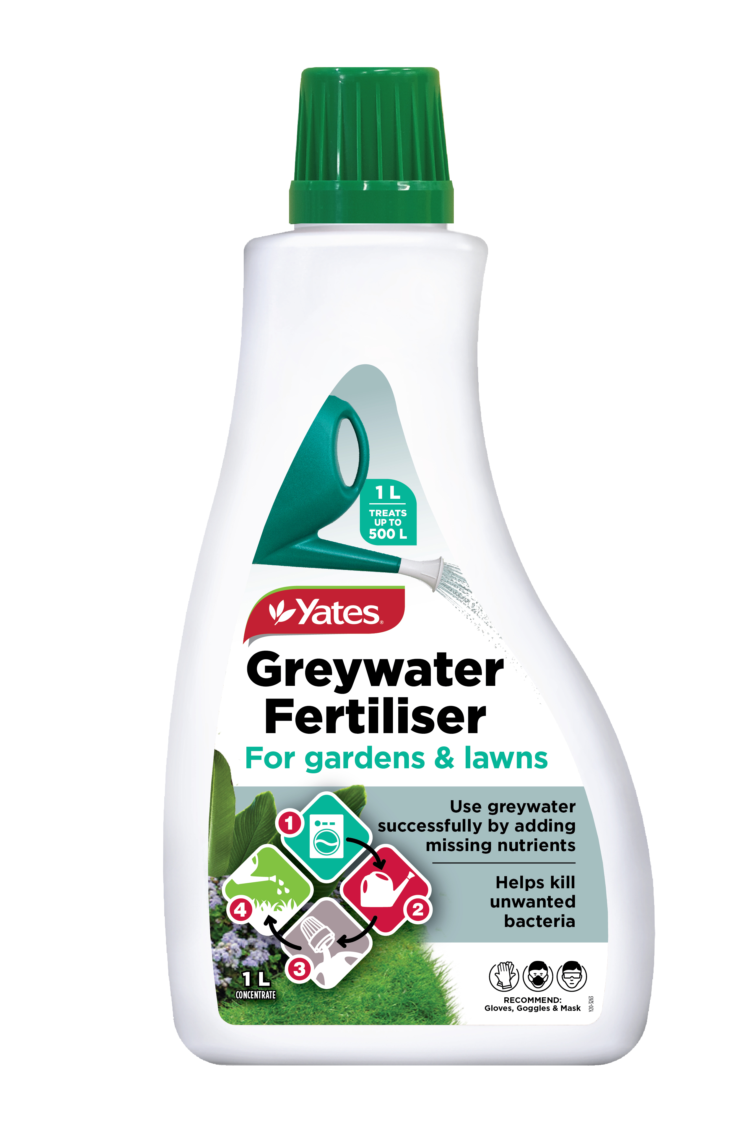Collect laundry and bathroom greywater in a bucket, tub or watering can and then add 20 - 40mL of Yates Greywater Fertiliser for every 10 L of greywater, and then apply around non-edible plants every 2 to 4 weeks. (Always refer to label).