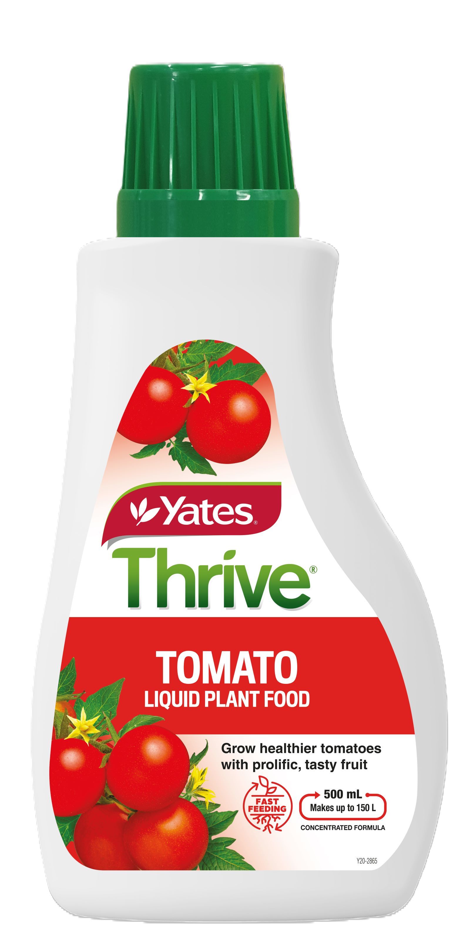 Yates Thrive Tomato Concentrate is a complete liquid plant food that provides tomatoes with the balanced nutrition they need to produce large crops of delicious fruit and strong, healthy growth. Thrive is a dual action formula that feeds through both leaves and roots, as you water. It works quickly – so you see results sooner.