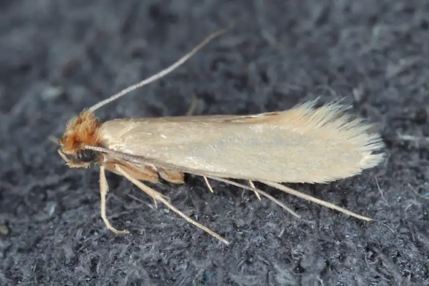 The head and collar region are covered in fine short hairs. On webbing clothes moths, these hairs are a reddish-gold colour, while case-making clothes moths are a light brown.