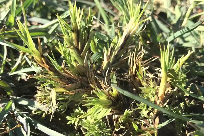 The damage caused by Couch Mites feeding is what you are likely to see, rather than the mites themselves. The damage is typically the tufted rosette growth known as “witches' broom”, and may lead to turf thinning and bare patches. Damage may occur in golf courses, recreation fields, and home garden lawns.